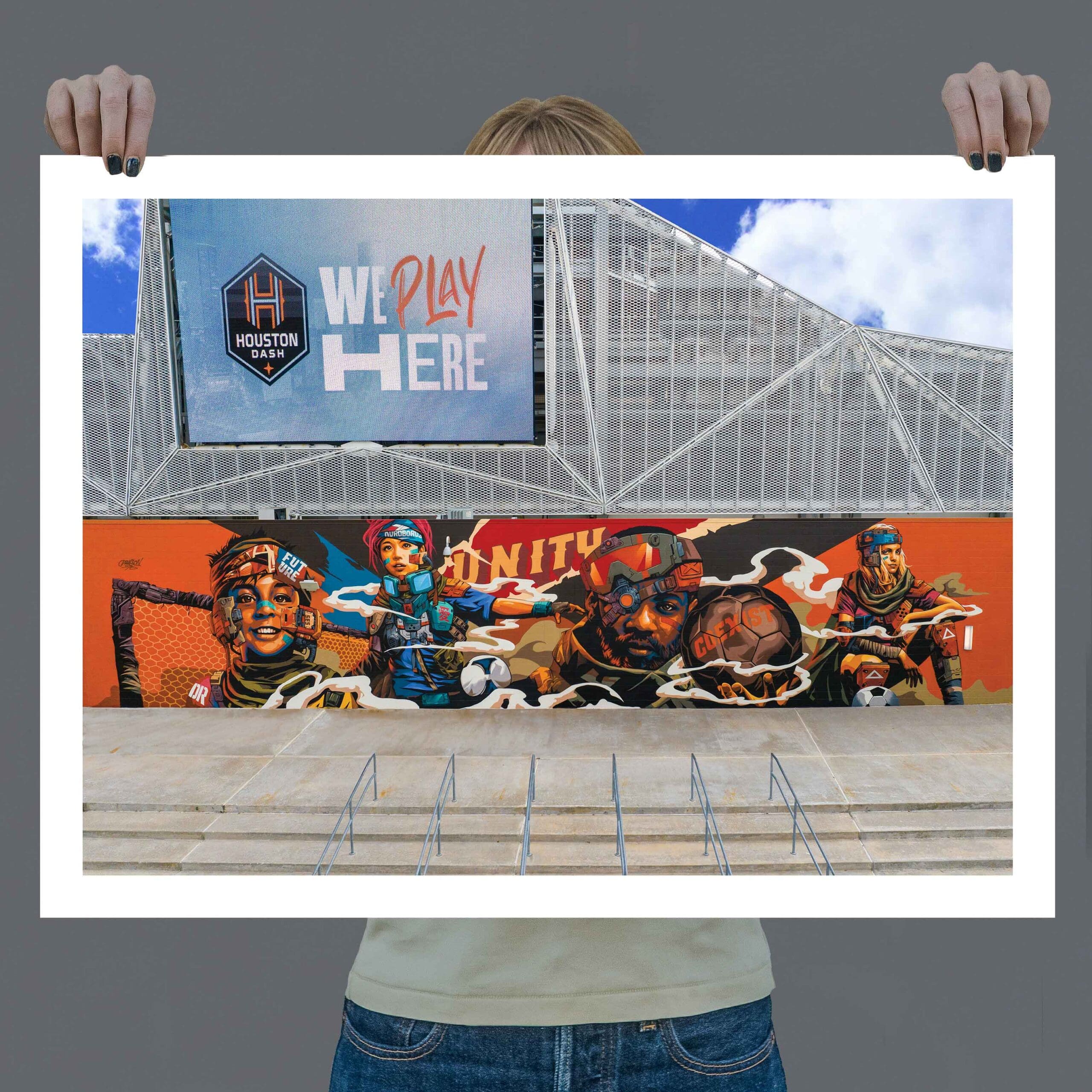 Interactive Signed Fine Art Print featuring the “Soccer Adventurers” mural created by artist Dragon76 in Houston, Texas.